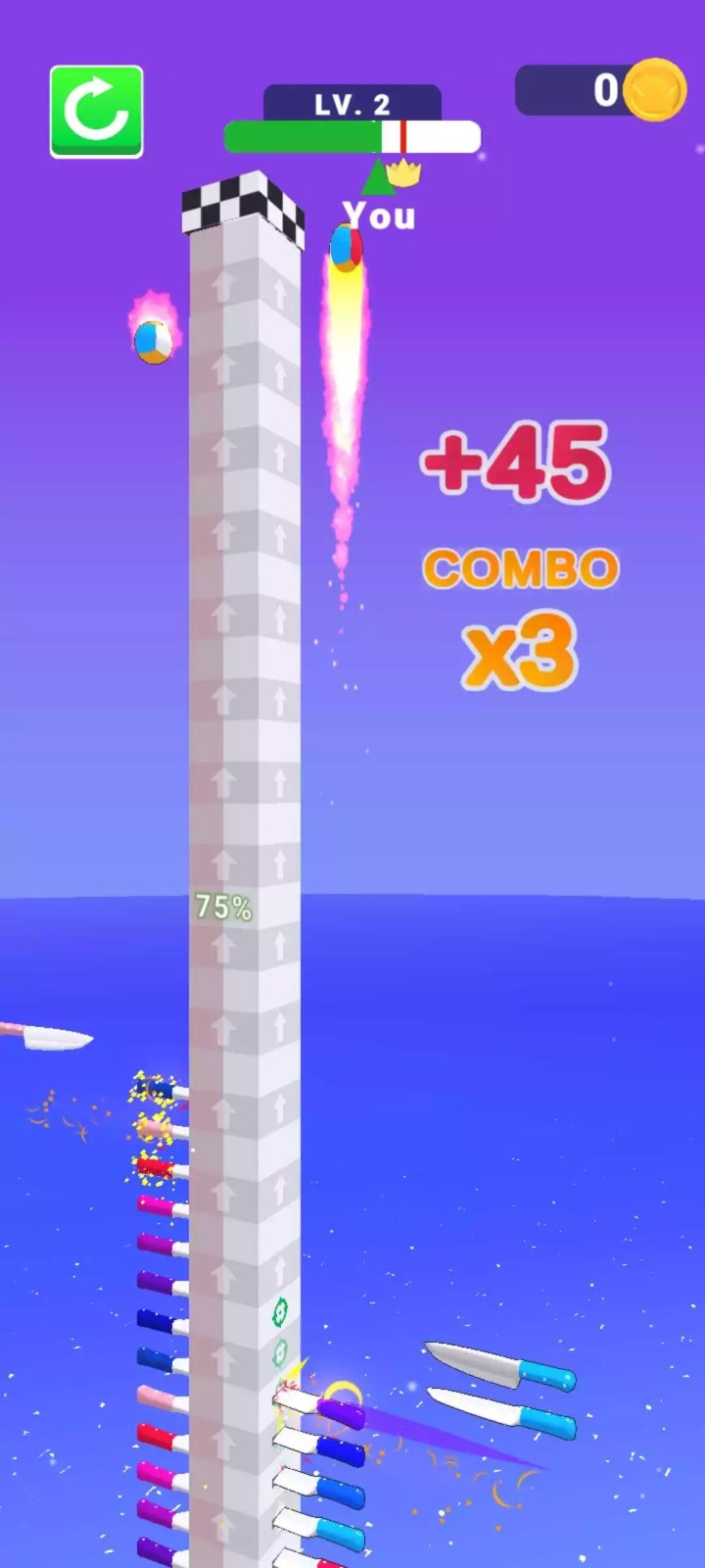 是一款考验玩家节奏的休闲游戏,我们需要有节奏的点击屏幕投射飞刀,让球稳稳的上升,节奏把握得越好,球就会随着飞刀的节奏越飞越高,从而获得更多的奖励,享受一场极其刺激有趣的冒险节奏挑战,休闲有趣的玩法,非常适合玩家休闲游玩!