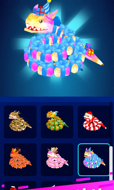 3、玩家操控蛇类角色,通过吃光点等成长,画面展现不同等级、外观的蛇,如彩色条纹蛇、花纹蛇等,体现成长与竞争。