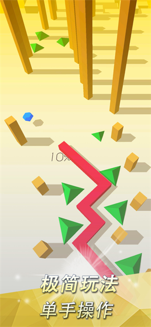 采用竖屏3D建模技术,构建出简约而富有艺术感的画面。玩家操控的线条呈现为立体方块形态,随着前进不断延伸。场景中的障碍物均由棱角分明的几何方块组成,色彩简洁却层次鲜明,营造出清晰而动人的视觉风格。