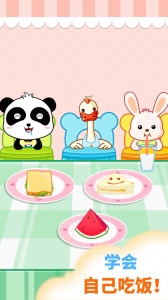 宝宝要学习自己吃饭哦!戴上围兜,坐在餐桌前,把饭菜放进嘴巴。宝宝想吃什么呢?三明治?牛排?还是水果?别忘了喝点水,这样才不会噎着。