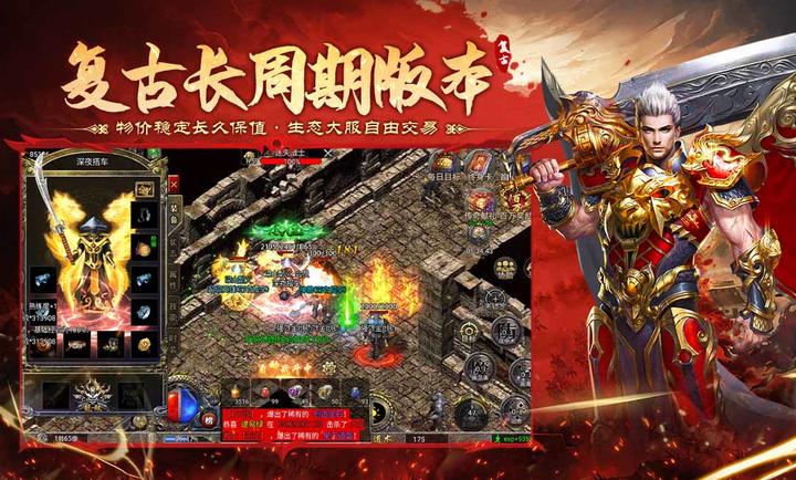 3.多人互动:游戏支持千人同屏激战。玩家可以组建或加入行会,与兄弟并肩作战,参与游戏的沙巴克攻城战。恢弘的战场、热血的对抗,让你重温当年与兄弟一起攻占沙城的激情岁月。