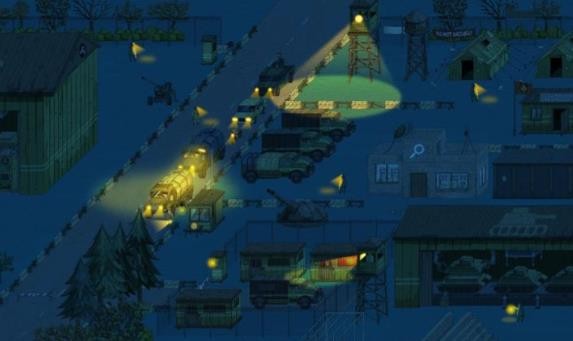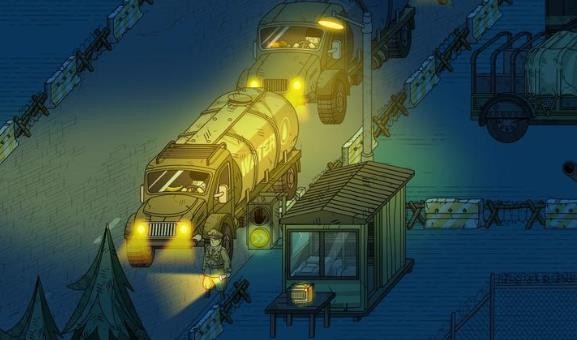 3、采用2D卡通的美术画风,以偏灰暗的色调精准营造出冷战时期边境车站的压抑氛围感,凭借细腻的人物设计 —— 包括丰富的面部表情、生动的肢体动作,精致的场景细节 —— 比如检查站的布局规划、各类车辆的结构特征,进一步强化游戏的视觉沉浸感。