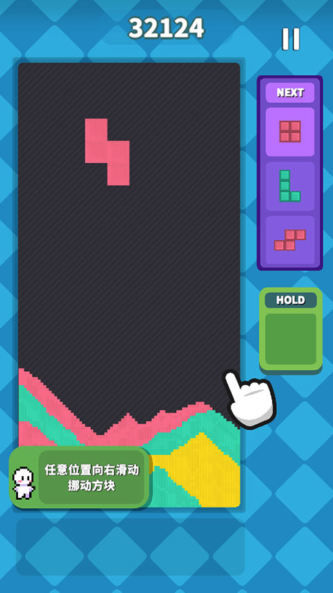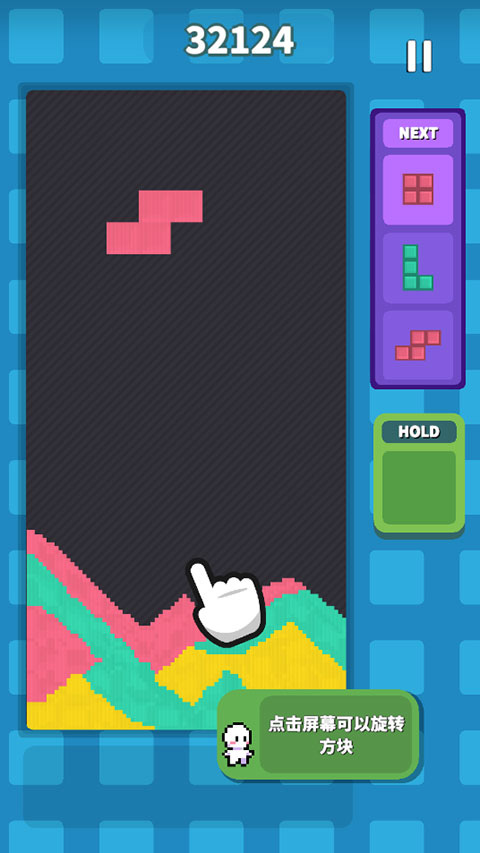 2、流沙世界:设定在一个由彩色流沙构成的像素空间中,方块落地后会如沙粒般流动,形成不断变化的地形结构。