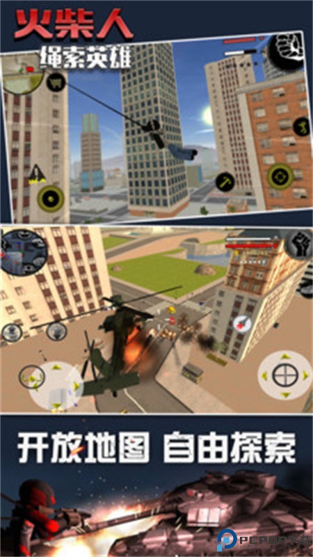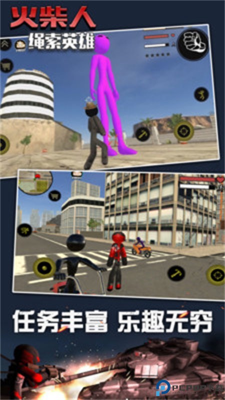 1、经典火柴人形象与蜘蛛侠式移动,以简约火柴人为主角,通过绳索技能实现高楼间自由穿梭,类似蜘蛛侠的立体移动方式。