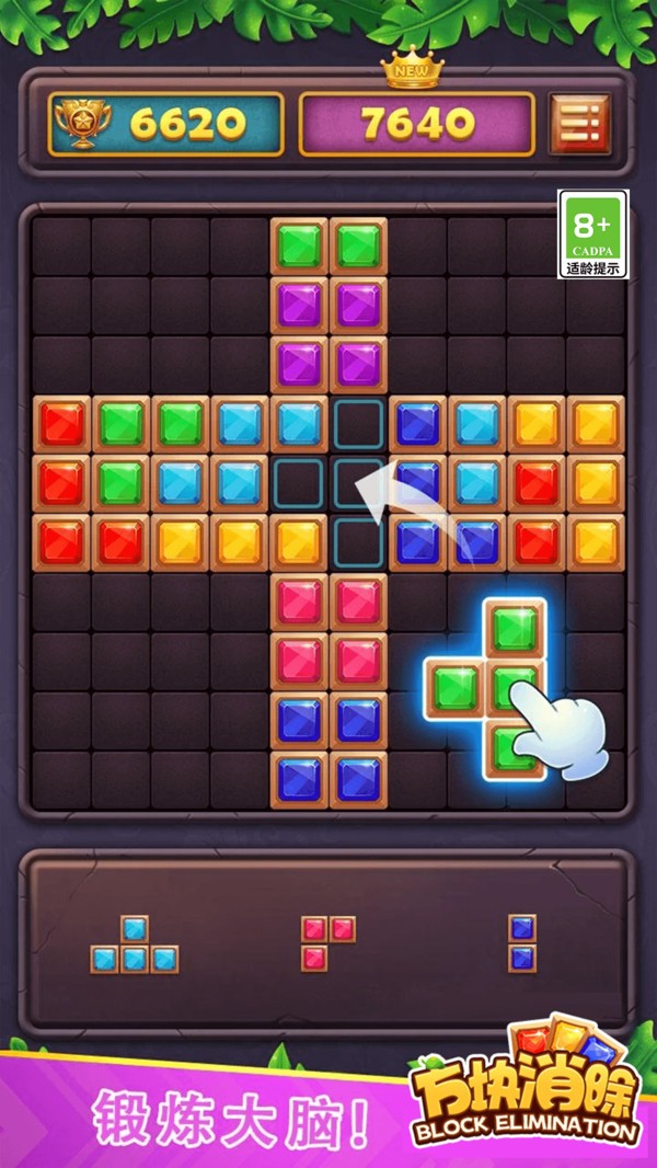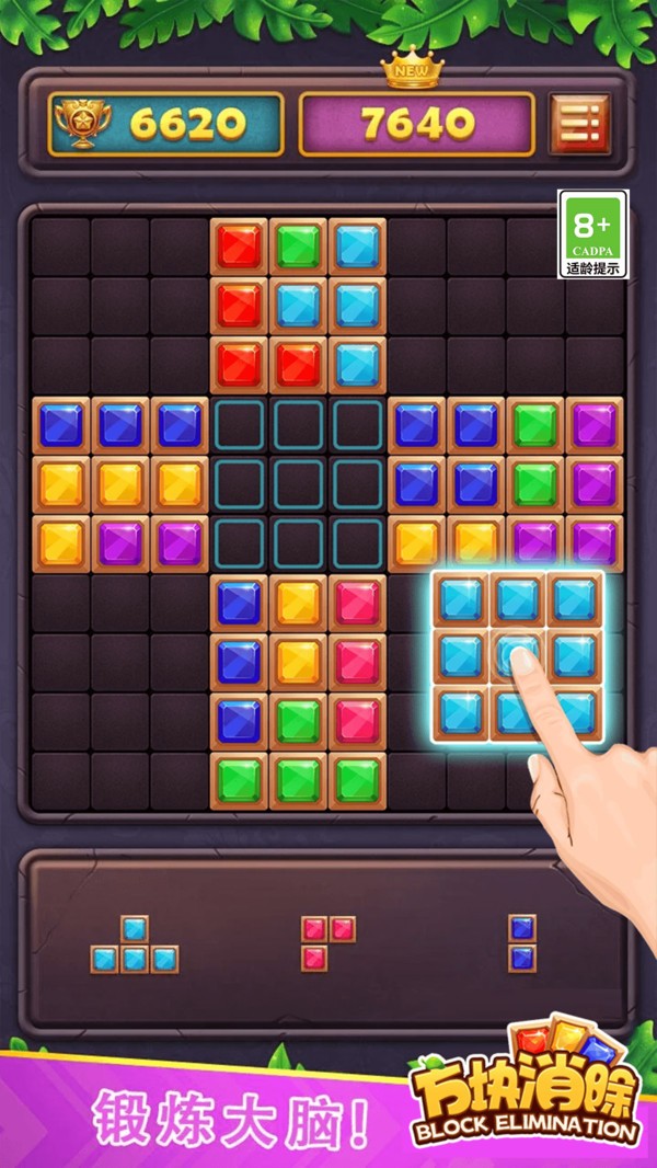 1.将屏慕下方的三个方块拖入宫格中,一行或一列铺满即可消除,在确保后续方块可放的情况下,实现消除。