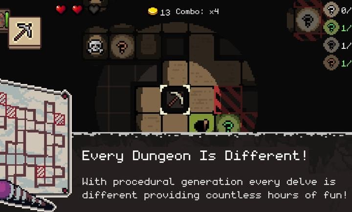 由于每次仅能携带有限数量的物品,你必须根据当前情况与关卡特点,谨慎决定携带何种工具。每个地牢的结构均为独立生成,布局无一重复。