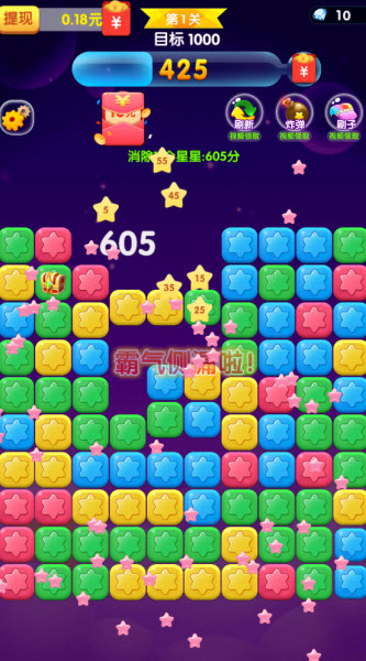 消除星星乐赚钱游戏是一款经典三消休闲闯关游戏,融入了许多不同难度的关卡选择挑战,在关卡内只需点击两个极以上相邻的同色星星进行连击消除,使用不同的道具加快本身的速度,快速的消除屏幕中更多的星星获得高分,顺利达到通关需求取得胜利,操作十分简单易上手,适合各个不同年龄段的玩家,大家千万不要错过哦!