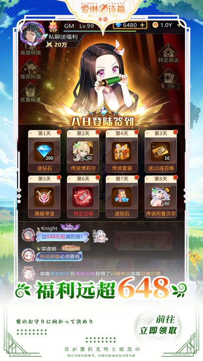 lv888:高级召唤契约*1、普通寻宝凭证*2、竞技凭证*1、钻石*100