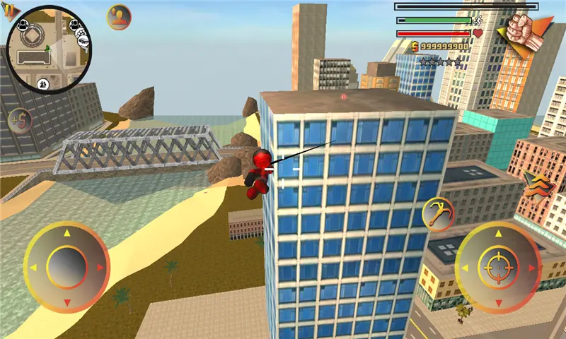 5、点击左侧的摇杆可以控制火柴人进行移动,点击右侧的钩子可以化身蜘蛛侠自由穿梭,点击“人”的图标可以跳跃,点击瞄准镜图标可以进行攻击