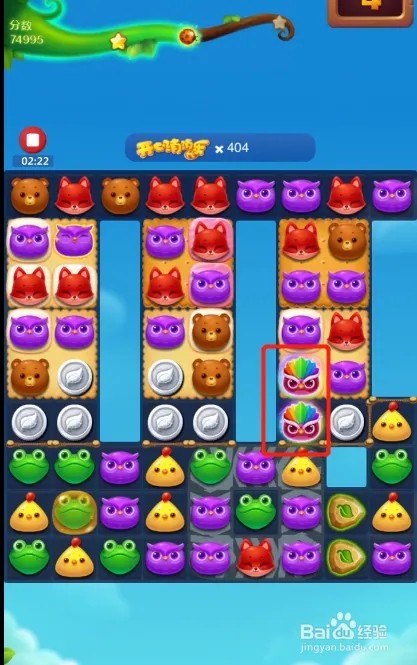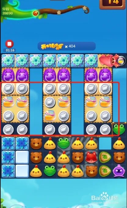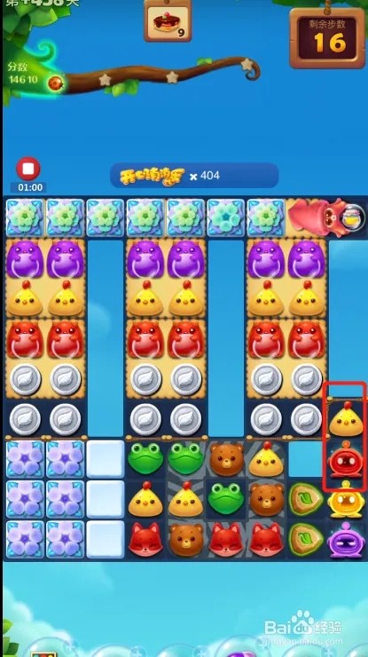 2、第二步合成小黄鸡,这样2个魔力鸟就用掉到一起,这样炸开后,小动物们才能从上面掉下来。