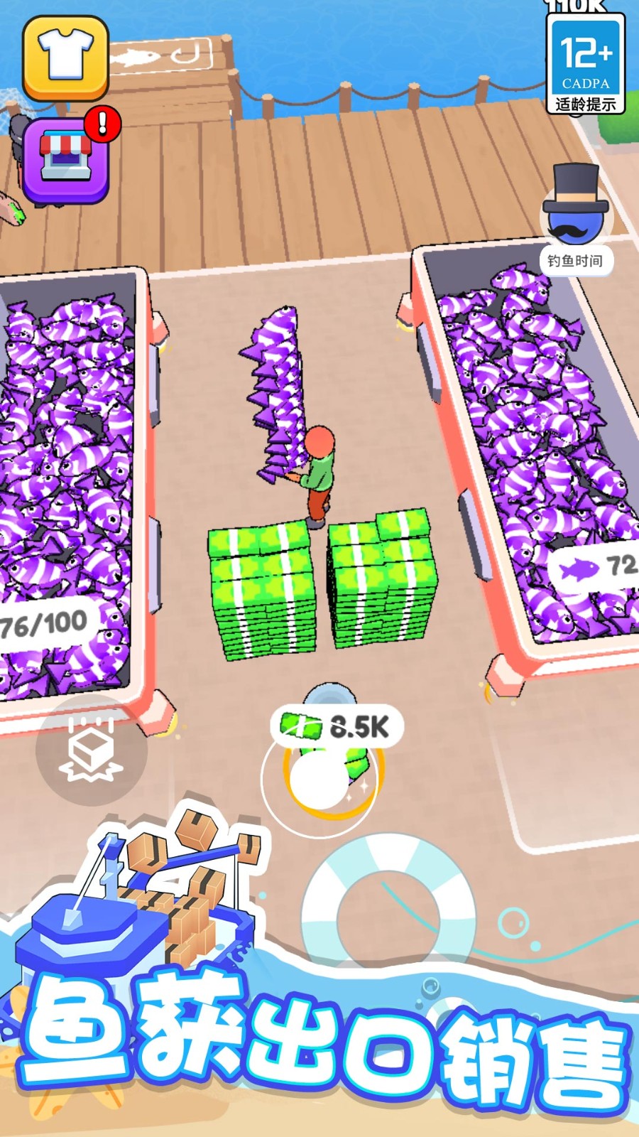 自己手动卖鱼获得钞票,当你的钱达到可以雇佣打工的人时,就付钱来卖鱼。