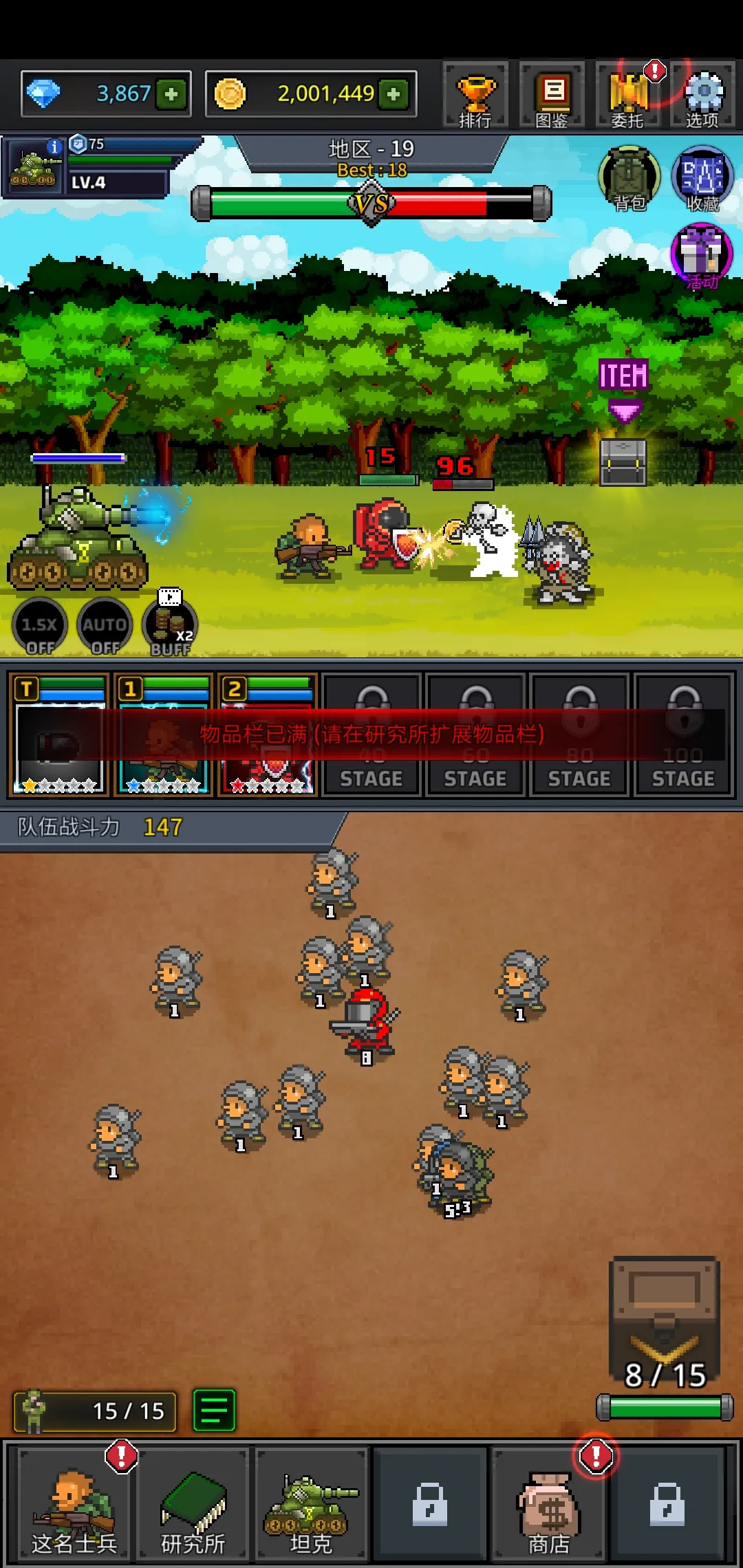 1、游戏中点击右下角的箱子可以不断召唤士兵。