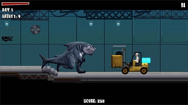3、左边按钮上滑为跳跃、下滑为蹲下,然后通过左边按钮左右滑动控制鲨鱼前进,并点击右边按钮吃掉途中出现的人类,