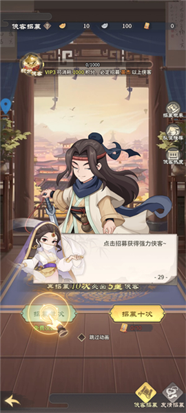 通过升级、升星、武学和秘籍系统,提升侠客的属性和技能效果。