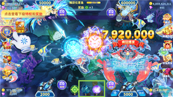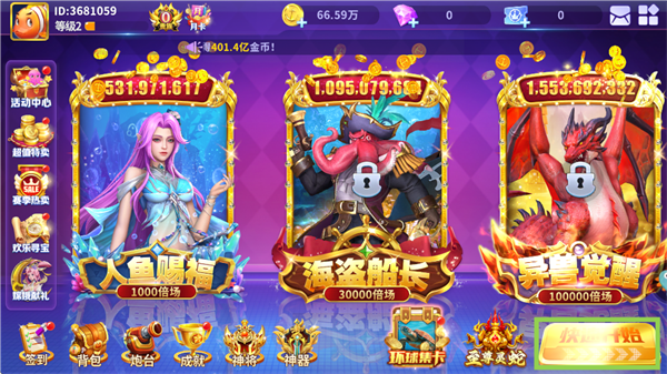 3、丰厚奖励,乐在其中:海量游戏福利持续放送,无需氪金也能轻松上手,升级就有等级专属奖励,完成每日任务、主线任务即可领取金币、道具、炮力加成等丰厚福利,福利兑换无门槛,让你的捕鱼之旅一路顺畅,欢乐不停歇。