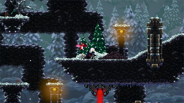 整个游戏世界是一笔一笔画出来的像素艺术。不是那种模糊的复古滤镜,而是精细到每一块砖的纹理、每一片树叶的抖动、每一束光的渐变都清清楚楚。暗黑的氛围从画面底色里透出来——废墟里冒着余烬,地牢深处闪着幽绿的光,天空永远是铅灰色的。复古的质感配上现代的细节,看一眼就知道,这地方不是什么善茬。