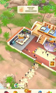 2、高自由度的放置经营玩法,可自由建造餐厅、客房、娱乐设施等,并通过升级提升建筑等级,解锁更多功能。