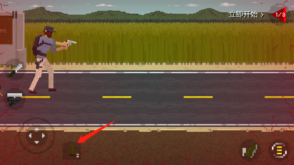 3、在僵尸靠近时,刚好子弹用尽了,不要慌,点击右下方的踢腿图标把僵尸窜到地上。