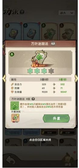 前期我们没有强大的作战能力,所以续航是首要的,前期我们可以用木功法来进行一个过渡(木的话竞技场和推塔能力较弱,所以前期我们升到1星左右就差不多了,用于前期过度),功法推荐万叶迷踪步,自带闪避和强化治疗效果,极大的提升我们的生存能力,辅修再选择一本功法,这里推荐同系,虽然辅修功法只有数值加成,附带的技能是无法生效的,但是可以影响局内属性装备出现的概率,打个比方,比如我选择了主修木辅修木,游历内木属性装备出现的概率是80%左右,如果我选择了主修木辅修土,游历内木属性装备出现的概率是60%左右,同属性功法可以让我们的装备更快成型,同时同属性装备相邻近也会带来一定的效果加成,所以前期我们优先同系功法开局,加快我们的体系成型!如果不喜欢同系功法开局的话,可以选择升星较多的功法作为辅修即可。