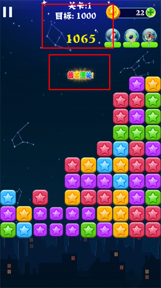 4、最后没有星星可以消除,并且分数达标后即可顺利通关。