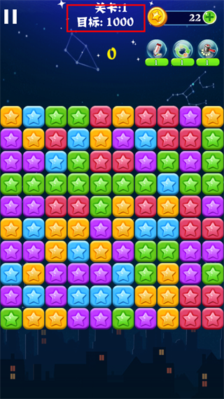 3、然后点击相邻的同颜色星星就能够将星星消灭,并且获得分数。相邻的同颜色星星越多,获得的分数越多