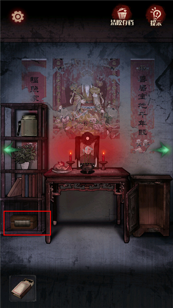 13、向右来到灵位场景,点击左边货架下面的箱子,输入密码5863,打开箱子,获得【卧房钥匙】。