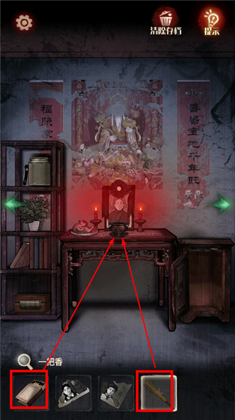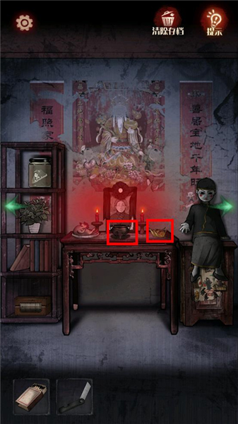 3、向右移动至灵位场景,拿走桌子上的【纸元宝】,移动香炉,获得【生锈的钥匙】,将【纸元宝】交给纸人,使纸人离开。