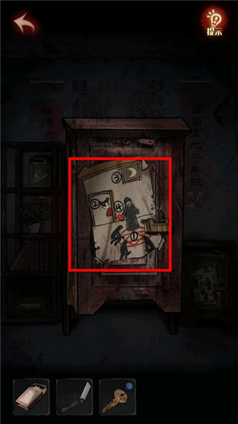 4、查看纸人下面的柜子,记住上面的图案:1阵图,2小女孩,3月亮,4书,根据这些线索打开上面的锁,获得【旧衣服】和【暗红钥匙】。