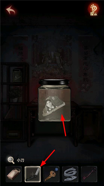 5、点击左边货架最上面的玻璃罐,使用【小刀】打开,获得【碎照片3】。