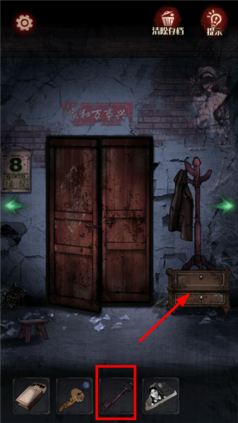 7、向右回到大门口,点击衣架下面的抽屉,使用【暗红钥匙】打开,获得【馒头】。