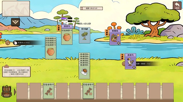 战斗之外,还有基地需要打理。手里攥着资源卡,在版图上找合适的位置打出基地建筑卡。采石场放下去,每过一段时间自动产出石头;浆果丛种起来,食物就不用发愁;哨塔建在路口,能给整个基地提供防御Buff。建筑和建筑之间还能形成联动,产出效率越来越高,增益效果越来越强。采集资源、建造设施、循环发展——方舟那个熟悉的采集建造循环,用卡牌的方式完整复刻出来。养好的资源用来强化恐龙卡牌,强化的卡牌再去打更难的战斗,环环相扣,根本停不下来。