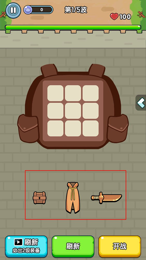 1、 背包管理:玩家在进入关卡前,先将装备拖入九宫格背包内,只要放得下可以全部携带。