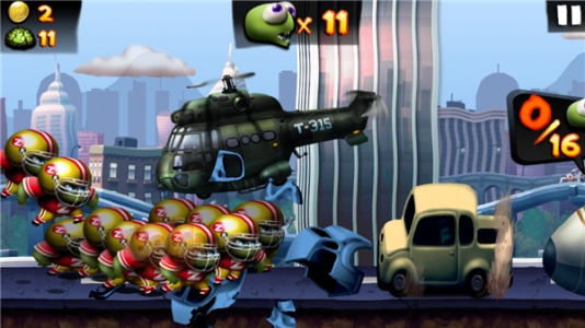 1、游戏操作:短摁屏幕短跳,长摁屏幕长跳。交通工具的话有一些如果你有足够的僵尸数量就可以把他撞开。汽车是四个,公交车是八个,飞机是十六个,坦克貌似也是八个还是六个来着的。在跑的过程中会出现幸存者。你所需要做的就是靠近他,你的僵尸会自动把他吃掉变成新僵尸。可以说一个僵尸就是一条命,但是僵尸越多越难跑就是了。可是有些场合你又不得不牺牲一下。就很气。