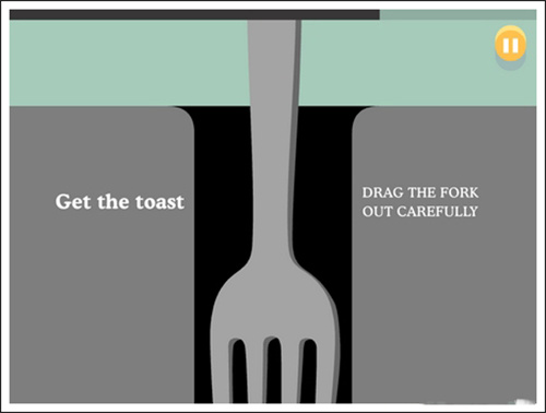 这关死亡率很高,具体玩法就是直线把面包拔出来不让面包触碰到面包机即可,小编在这关滑铁卢了若干次,后来终于掌握方法,先拔一次叉子,然后在面包上来以后松手马再按面包往上拔就可以了,当然,手是不能抖的,手一抖烤面包就直接变成烤人了,小人被烧焦以后的表情略悲伤。