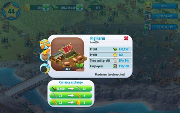 4.有时间时多建造耗时短,升级快的建筑,没时间多建造时间长利润高的,我用金钥匙兑换了一个巨坑5×5水上乐园,占地方,利润少,当然也有多的;