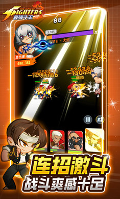 2、策略卡牌玩法创新,可收集近百位拳皇角色,通过“三神器羁绊”、“龙虎队”“怒队”等经典组合触发属性加成。