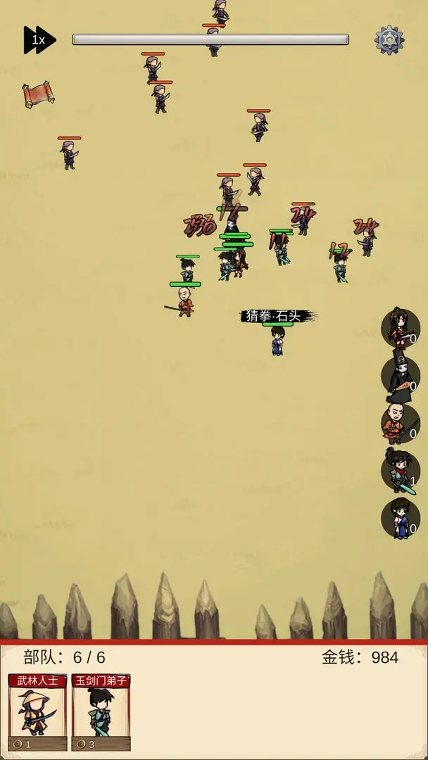 3、可以升级技能,提高角色伤害和暴击等属性。角色死后,继续招募,总数不超过5个就可以。