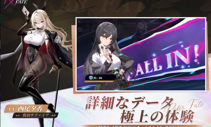 扑克命运日服手游是一款以二次元美少女为主题的卡牌策略手游,基于德州扑克标准规则,每位玩家发2张底牌,与5张公共牌组合成最强牌型(如皇家同花顺、四条、葫芦等),支持锦标赛、限时快节奏模式(如“全押或弃牌”)、组队排名赛等,通过观察对手下注模式、表情和动作,判断其牌力并制定策略(如虚张声势或稳健跟注)。包含星宫加奈(CV:上坂堇)、望月冰见夜(CV:原由实)等数十位美少女角色,每个角色拥有专属动态立绘和语音。