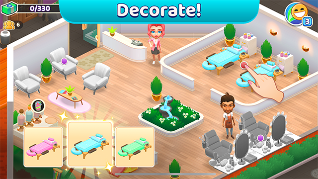 从一家小小的水疗馆起步,你需要亲手将它一步步打造成当地知名的休闲胜地。升级墙壁地板改善环境,添置更专业的设备提升服务品质,扩建功能区容纳更多顾客。与此同时,你的管理技能也在实践中不断精进——学会控制成本、优化排班、提高员工效率。水疗馆越建越好,你也在成长为真正的经营高手。