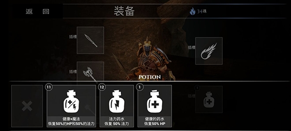 二、法术插槽:暗刃之魂小轮盘最下面第四个按键原来是给法术的,之前太心急都没开启,点击背包,点击右边上面的插槽就可以用魂购买法术了,总共四个法术,用了前两个(因为还没开完就通关了。