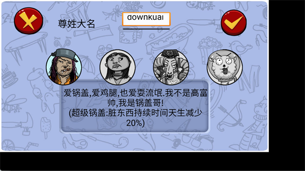 输入你的「尊姓大名」。选择角色:不同角色有专属被动技能,比如「锅盖哥」可以让脏东西持续时间天生减少 20%,根据喜好选择即可。点击右上角对勾确认,完成角色创建。