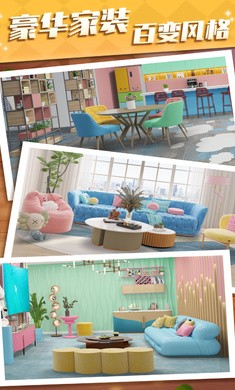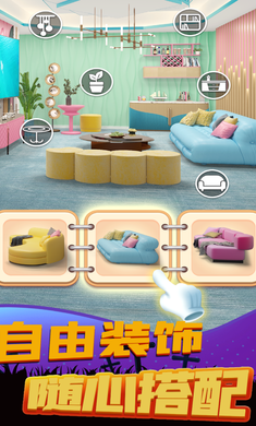 1、游戏开始,当选择一处地方需要装修时,使用一定的金钱后会出现三个不同风格的家居,根据自己的喜好来进行搭配。