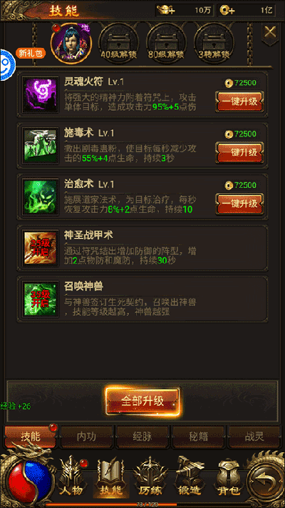 5、在技能中,玩家可以通过升级技能的方式来获得更好的体验;