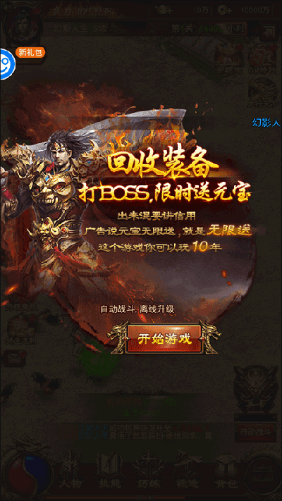 游戏内含点充福利,无限手撸点充元宝。点一点,元宝就到手;撸一撸,充值卡进背包。保底送30万真充,不花钱也能享受充值玩家的待遇。点充福利,手速越快,元宝越多。