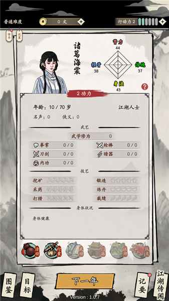 4、进入游戏如图,游戏采用文件剧情点击玩法,玩家需合理搭配每一年要做的事来提升武功。
