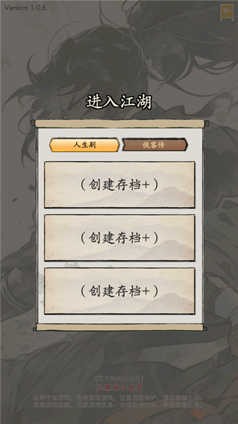 1、进入游戏选择模式,现有人生剧和侠客传两种模式,侠客传模式需通过人生剧后解锁;