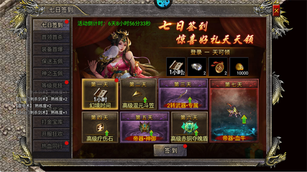 开服七日签到活动,每日登录可领幻境时间、高级材料、专属武器,累计签到第七天可直接领取稀有帝器・血牛坐骑,是新手前期获取核心资源的重要途径。