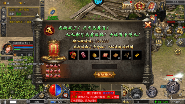 开服专属福利,输入激活码SVP888即可免费领取30天月卡特权,还能获得技能书、金币、材料等新手礼包,解锁自动战斗、随身仓库、随身回收等便捷功能。
