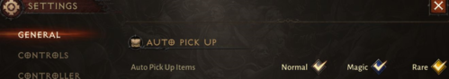 1、设置物品自动拾取:英文版是SETTINGS -> GENERAL -> AUTO PICK UP,有3个选项框全部打勾,暗金物品不能自动拾取,记得手动捡;