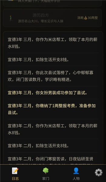 2、沉浸式的趣味文字探索,将以文字为媒介,探索江南烟雨世界的每一个角落,过程中会获得有限的资源(如粮食、银两、道具、技能点等),需合理规划、灵活运用这些资源,应对生存挑战、解决剧情难题,保障角色顺利推进人生历程。